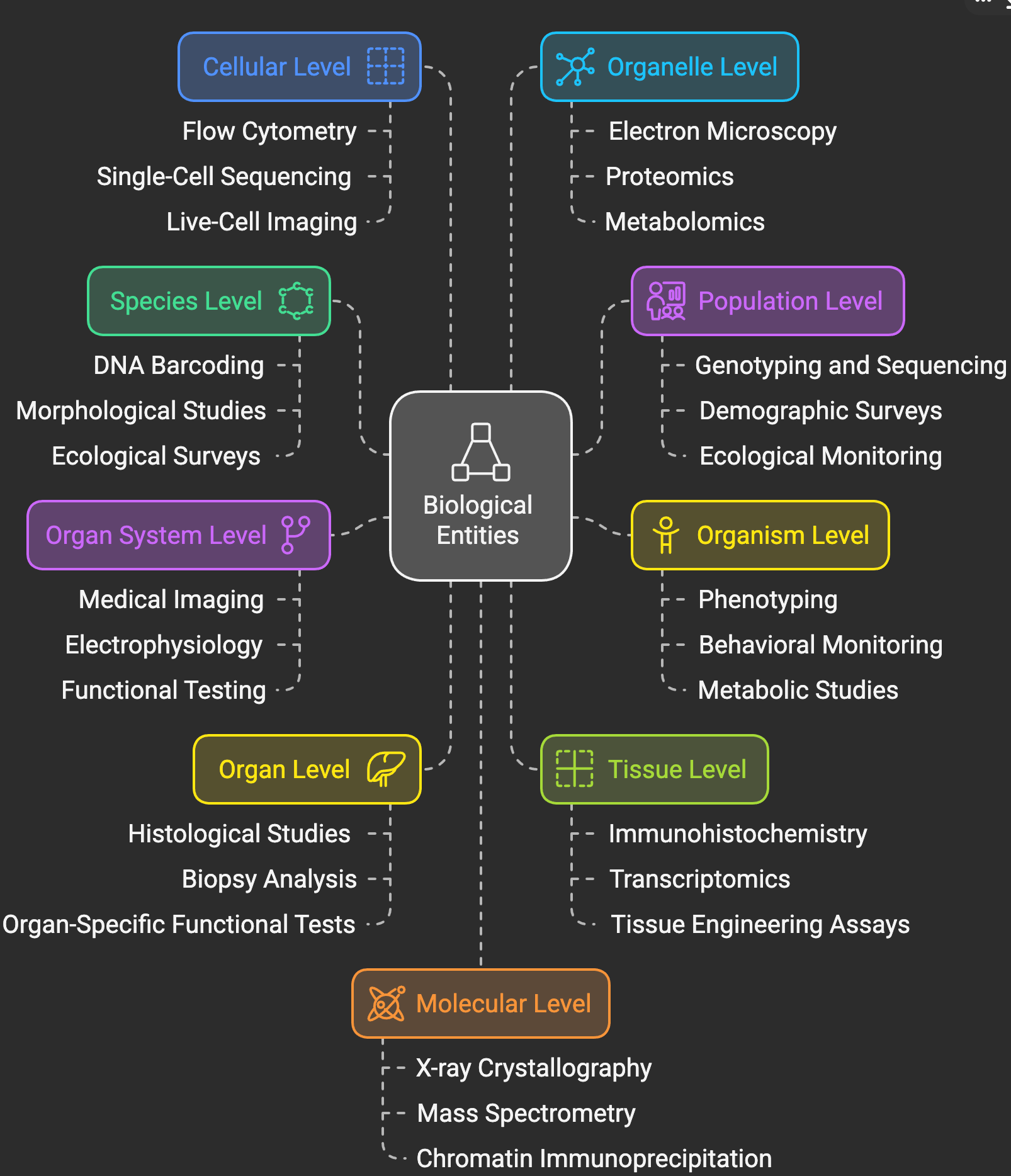 Biology is inherently hierarchical. Changes at one level can cascade across others. For example, a single mutation in DNA (molecular level) can alter protein function (cellular level), disrupt organ function (organ level), and manifest as a disease (organism level).